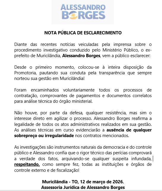 O ex-prefeito de Muricilândia, Alessandro Gonçalves Borges, passou a ser alvo de investigação do Ministério Público do Estado do Tocantins (MPTO) por suspeitas de irregularidades envolvendo contratos públicos durante sua gestão.